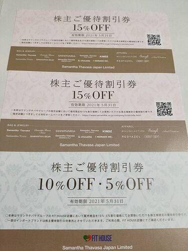 1年ほど前から持ちつづけているサマンサタバサの株主優待券が到着した。サマンサタバサと関連ブランド店舗での購入に使用できる割引券である。 サマンサタバサの株主優待は結構充実していて、8月末と2月末に100株以上保有している株主にこんな優待がある。