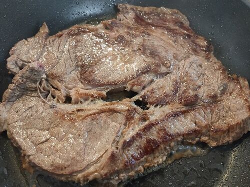 かなり暑くなってきたのでアメリカ産牛肉を買ってきた。もちろんスーパーで売っている一番安いやつ。 筋が多いのでハサミで切っていたら肉が2つに分離。そんなことは気にせずフライパンで焼く。ニンニクも胡椒も油も多めにして焼く。 こんな焼き方は邪道かも…